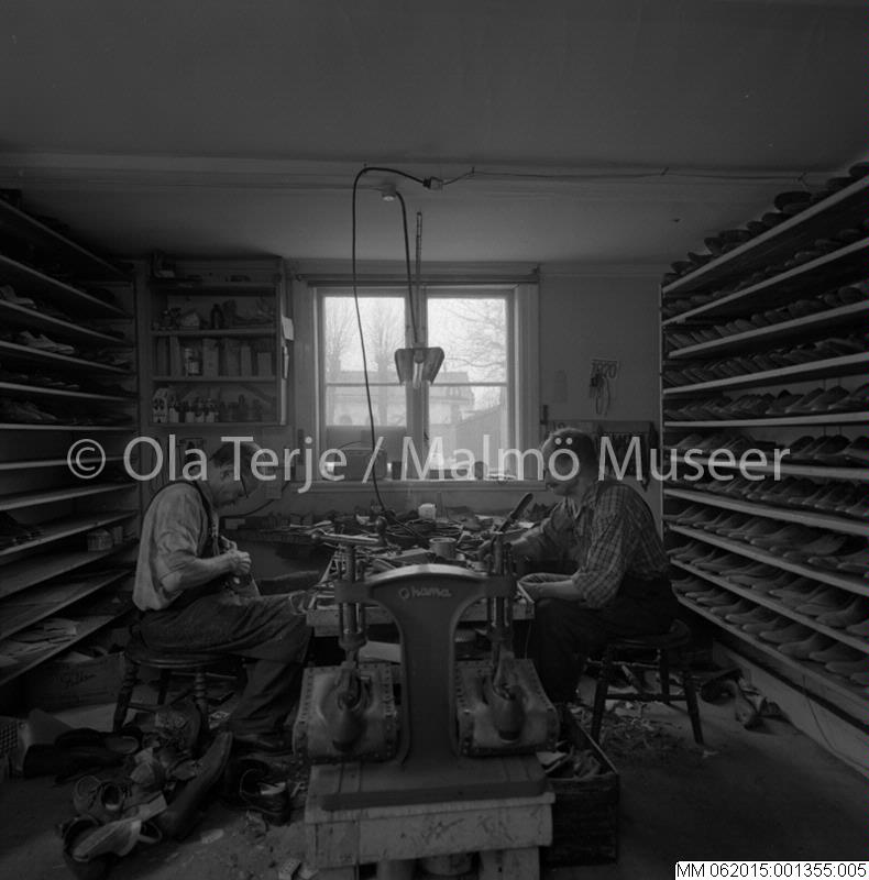 Skomakare Harry Jonsson (till vänster) och Erik Beckman i arbete på skomakeriet, Fiskargatan 30 i Kalmar 23/4 1970.