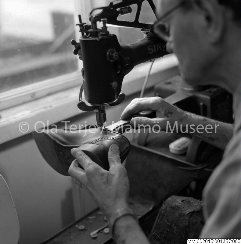 Skomakare Harry Jonsson vid symaskinen i skomakeriet, Fiskargatan 30 i Kalmar 23/4 1970.
