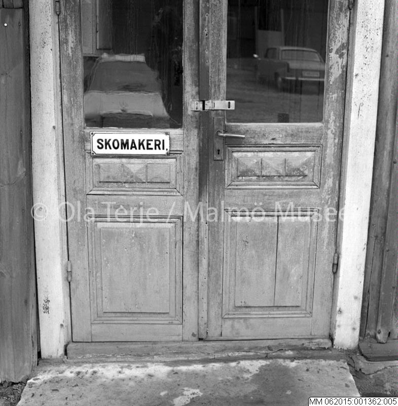 Ytterdörren till Erik Beckmans och Harry Jonssons skomakeri på Fiskargatan 30 i Kalmar, 23/4 1970.