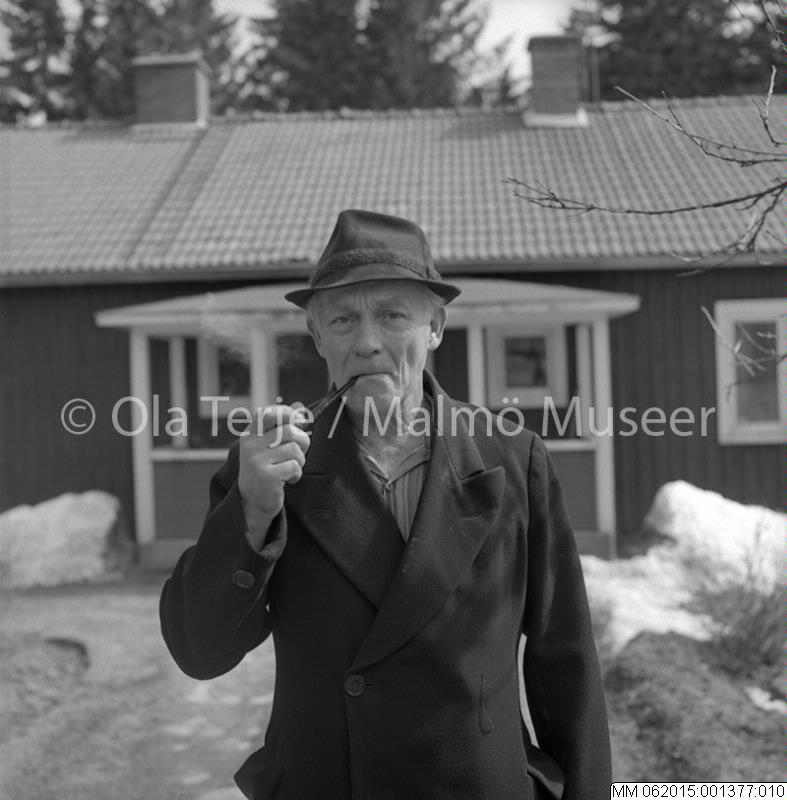 Träslöjdaren Nils Jonasson framför sitt hus i Vitteryd, Moheda 25/4 1970.