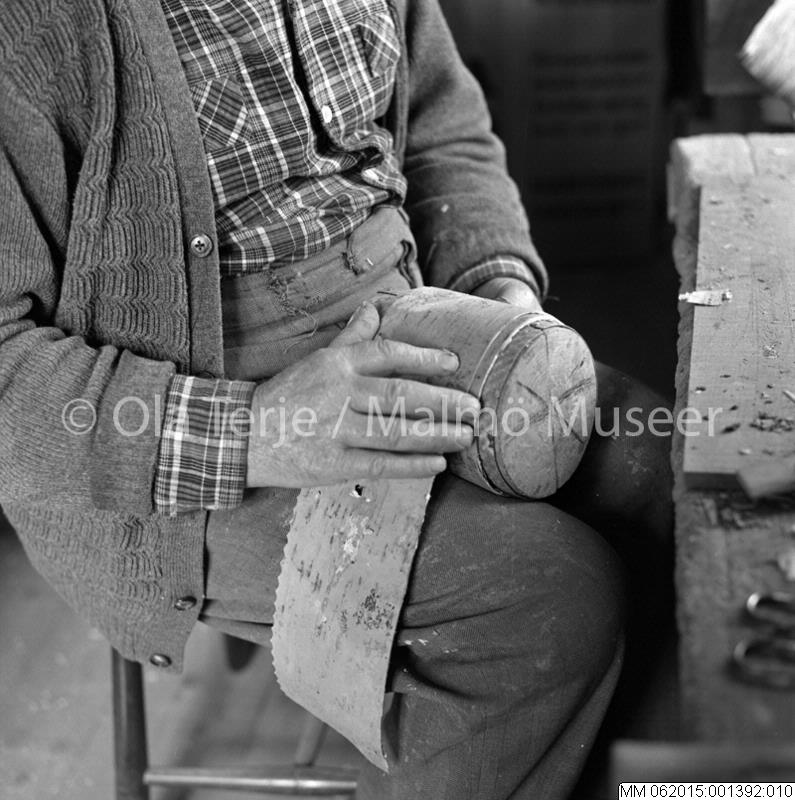 Näverslöjdaren Carl Gustavsson lägger på näver på en burk i verkstaden i Trekanten, 13/4 1970.