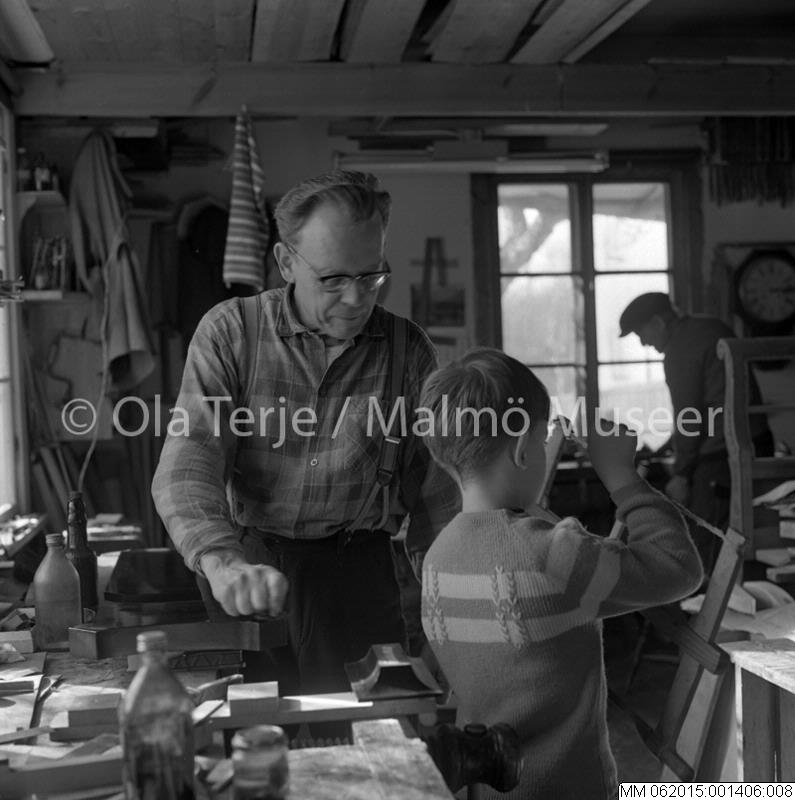 MM 062015:001406:008 :: besökare, man, medhjälpare, möbelsnickeri, pojke, verkstad, porträtt