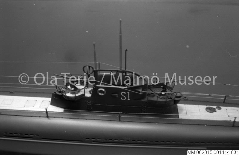 Ubåtsmodell S1 av den berömde modellbyggaren Hans Ellerström, från atéljén i Malmö. Han har även skrivit böcker om sin specialitet u-båtar. 800202.