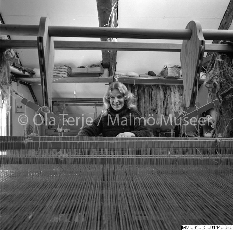 Textilkonstnär Gerda Wissler vid vävstolen, Lund 810108.