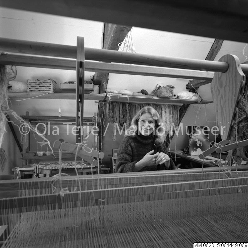 Textilkonstnär Gerda Wissler vid vävstolen, Lund 810108.