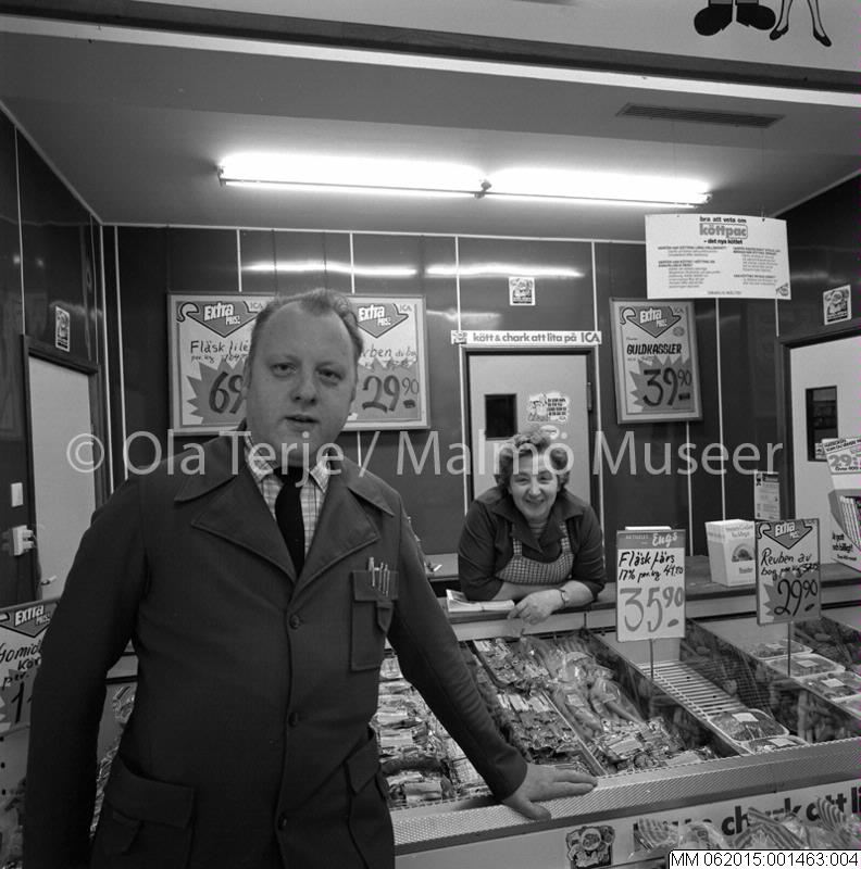 - Lanthandlare Kjell Eng i Skåne-Tranås poserar framför charkuterierna tillsammans med kvinna ur personalen, 830608.