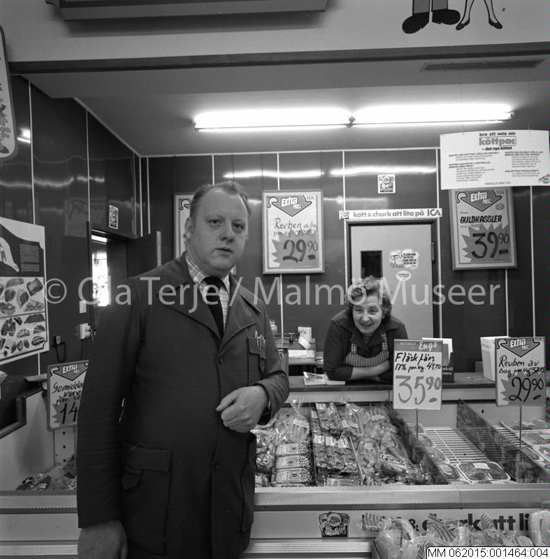 - Lanthandlare Kjell Eng i Skåne-Tranås poserar framför charkuterierna tillsammans med kvinna ur personalen, 830608.