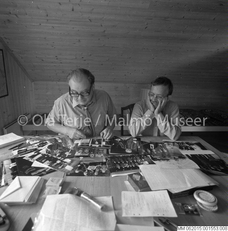 - Författaren Torsten Ehrenmark och Ola Terje. Denna bild togs en förmiddag i augusti 1973 hemma hos Torsten Ehrenmark, i hans sommarställe i Torsåstrakten i Småland. Troligen var det Torstens fru eller son som tryckte på knappen när de båda herrarna går igenom bilder. En bild som så småningom hamnade på baksidan till boken "Emmaboda i våra hjärtan" (A&K 1973). Vad som inte framgår är att Ola Terje kommit så gott som hade direkt från en kräftskiva hos någon vän i trakten, förmodligen Åfors, och var mycket bakfull, vilket knappast syns.