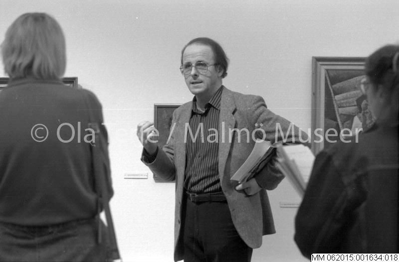 Ola Terjes utställning på Ystads konstmuseum. Museichefen Jan Torsten Ahlstrand berättar och visar. 1987.