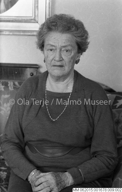 Porträtt av konstväverskan Thora Kulle som även drev vävskola, Lund 1959.
