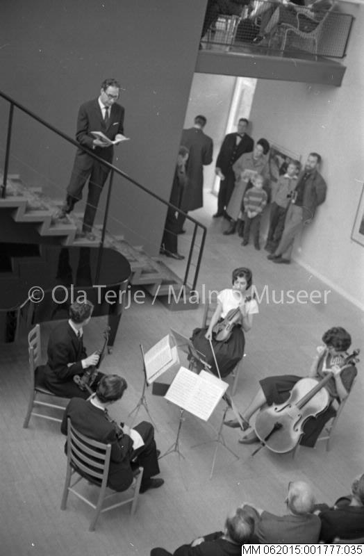 Vernissage på Lunds Konsthall med konstnären Max Walter Svanberg, okänd talare, stråkkvartett underhåller, Lund 1962.