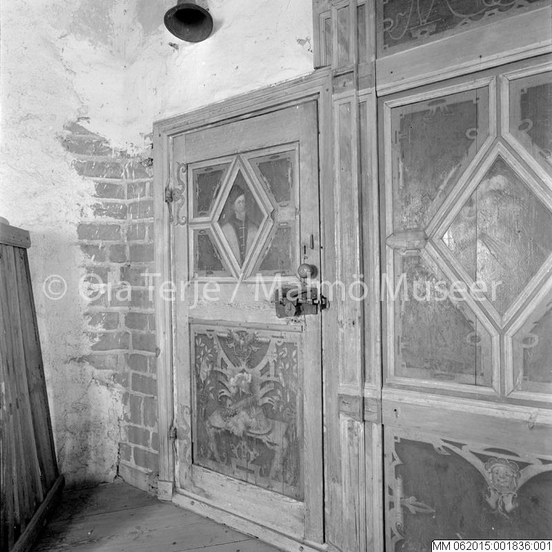 Interiör från Rydboholms slott, trädörr med målning, 1966.