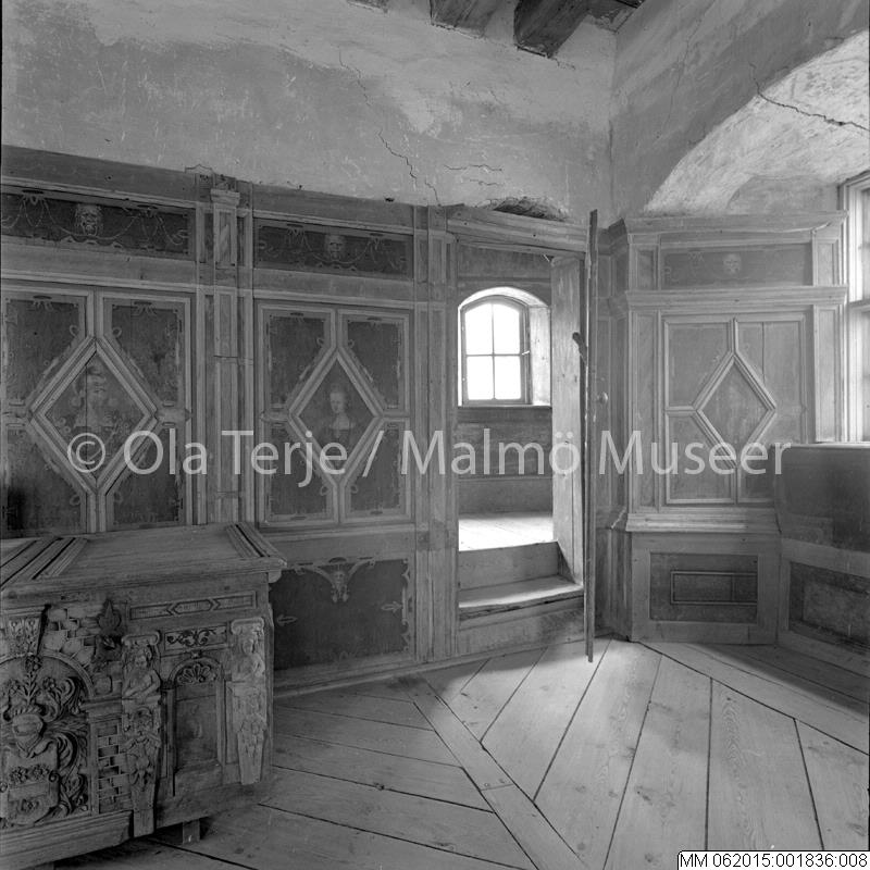 Interiör från Rydboholms slott, träpaneler med målningar, dold trappa bakom trädörr, 1966.