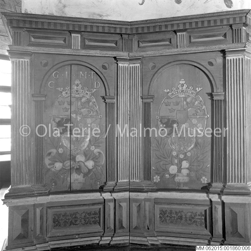 Interiör från Gripsholms slott, träpanel med målning och kungligt vapen med inskription, 1966.