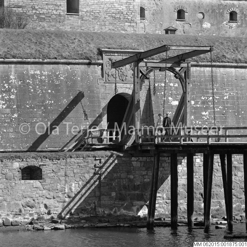 Exteriör från Kalmar slott, vallgraven och vindbryggan, 1966.