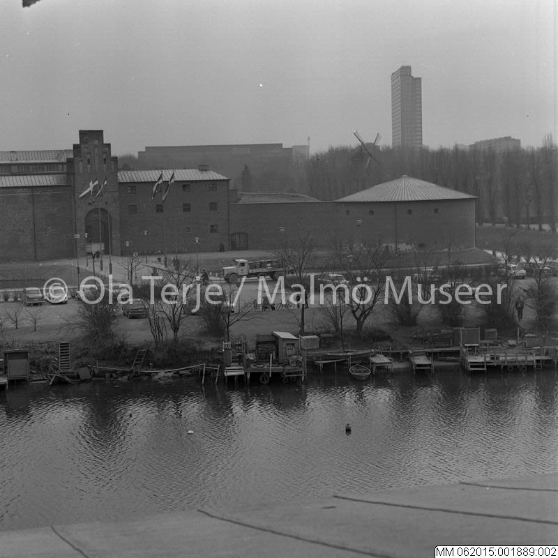 Exteriör från Malmöhus slott, med Slotts- och Kungsparken, Slottsmöllan, samt Kronprinsen i bakgrunden, Malmö 1966.