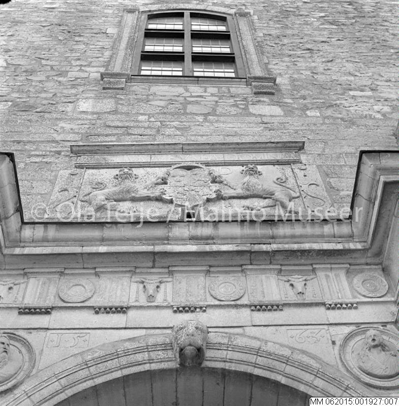 Exteriör från Vadstena slott, detalj från portal från 1563 med Hertig Magnus vapensköld, 1966.