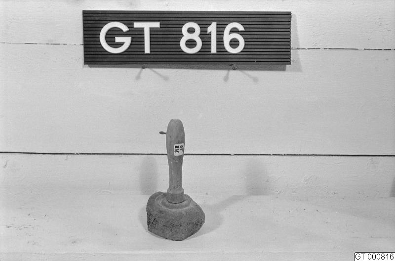 Träklubba med svarvat skaft. Hårt använd klubba av rot.