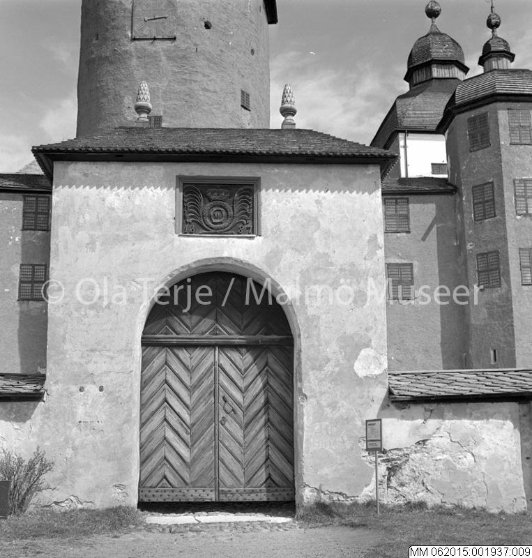 Exteriör från Läckö slott, portal med kungligt vapen för Karl XI - daterat 1687, 1966.