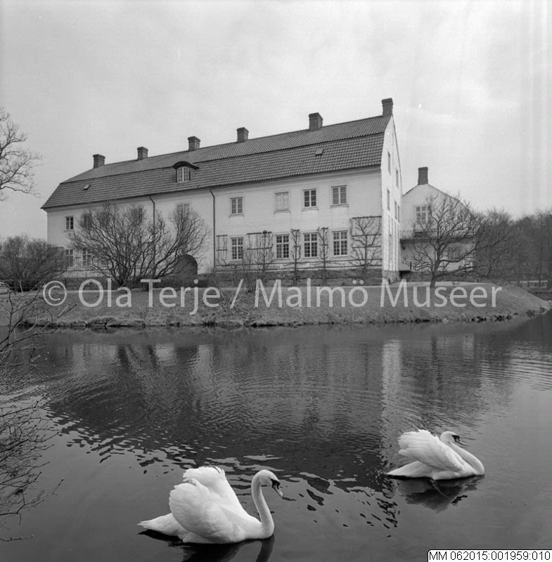 Exteriör från Skabersjö slott, svanar i kanalen, 1966.