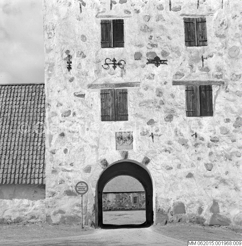 Exteriör från Hovdala slott, portal med minnesplatta över Kalmarkriget, 1966.