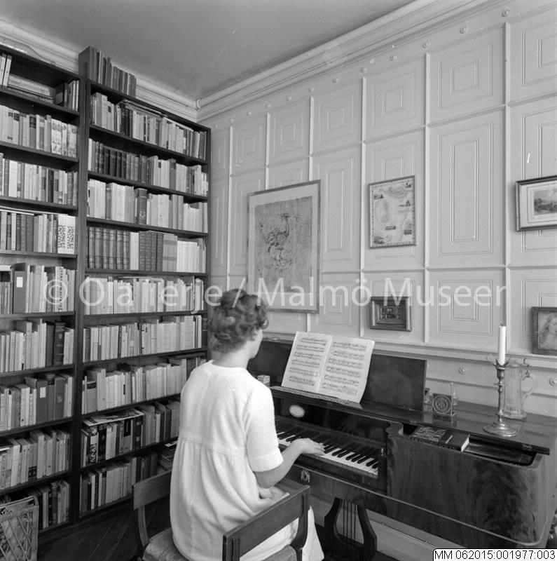 Interiör från Perssons hem på Sandgatan 6 i Lund, kvinna som spelar piano, 1960-tal.