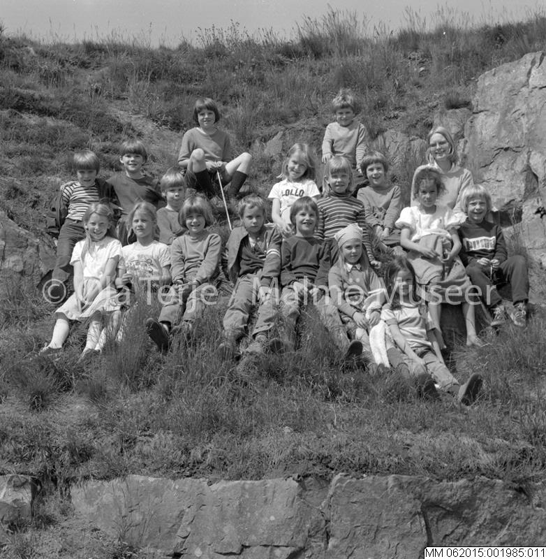 Klassfoto av en förstaklass på utflykt med sin lärare, 830607.