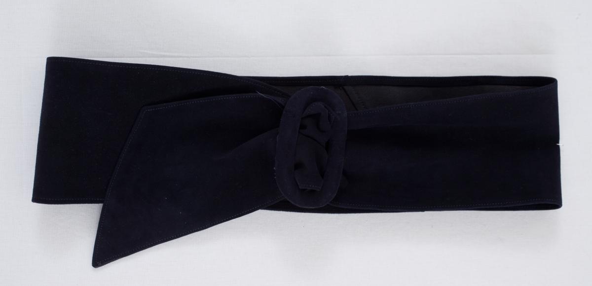 Skärp med mockasidan utåt avsmalnande åt midjan, Mockaklätt skärpspänne.
