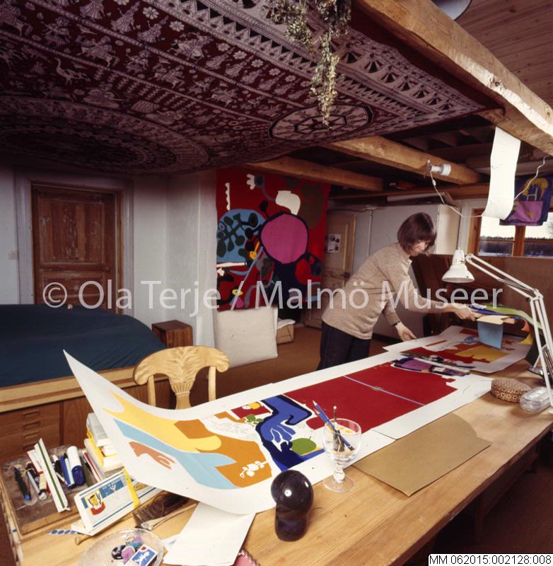 Ann i kombinerade sov- och arbetsrummet. På bordet skiss till utsmyckning (i trä och polykromt) på matsal hos Volvo, i bakgrunden applikation i filt.