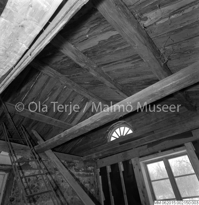 Fritt upp till yttertaket, bjälkar synliga, vid renoveringen av stugan i Alsjökulla, 28 mars 1970.