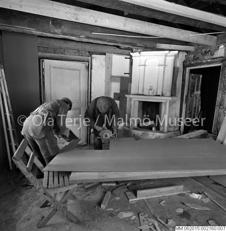 Hantverkare sågar till innerväggar, vid renoveringen av stugan i Alsjökulla, april 1970.