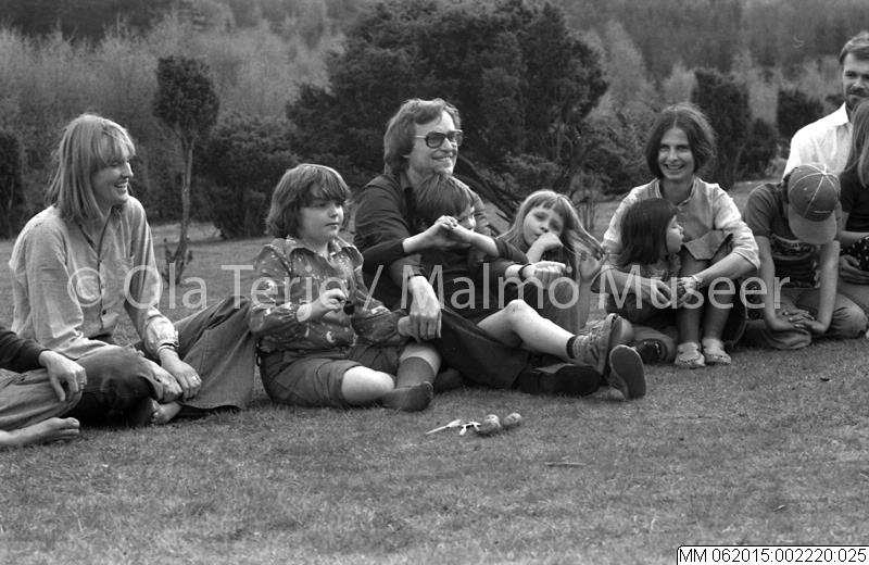 Elever och lärare från Waldorfskolan Rudolf Steiner i Lund, med Lars Wätte, på vårfest i Måryd naturreservat, Södra Sandby, maj 1978.