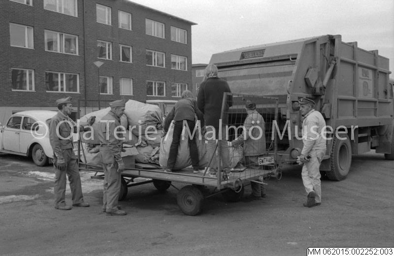 Vaktmästare och praktikanter vid sophämtningen, Bo-Skolan. Uppdrag för MKB Fastighets AB, Malmö 800306.