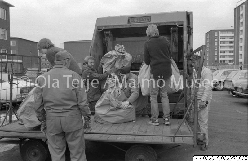Vaktmästare och praktikanter vid sophämtningen, Bo-Skolan. Uppdrag för MKB Fastighets AB, Malmö 800306.