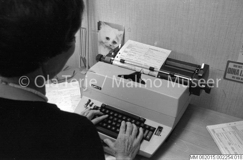 Interiör från MKB:s kontor, personal skriver ut hyreskontrakt. Uppdrag för MKB Fastighets AB, Malmö 800820.