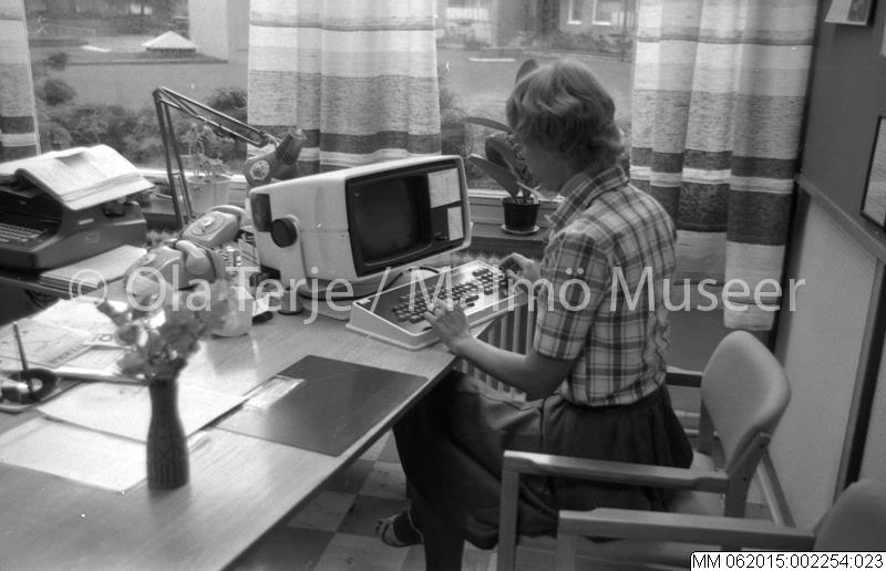 Interiör från MKB:s kontor, personal vid datorn. Uppdrag för MKB Fastighets AB, Malmö 800820.