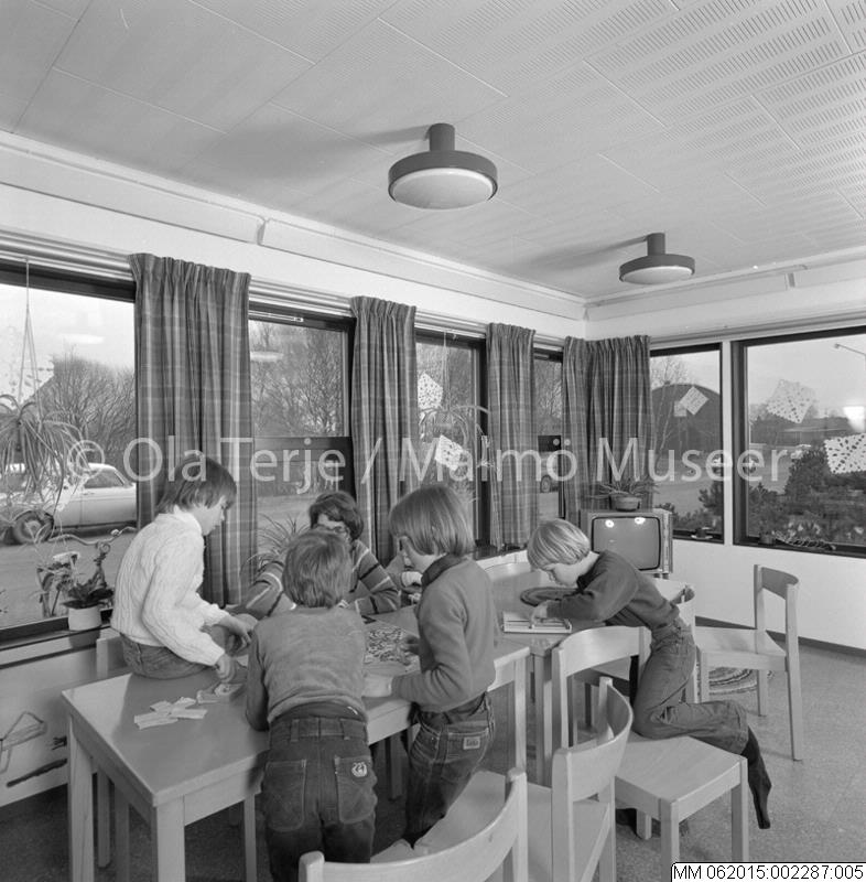 Interiör, lågstadiebarn och lärare i skolsal. Uppdrag för MKB Fastighets AB, Malmö 780301.