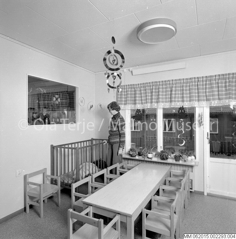 Interiör, barn och lärare på dagis. Uppdrag för MKB Fastighets AB, Malmö 780410.