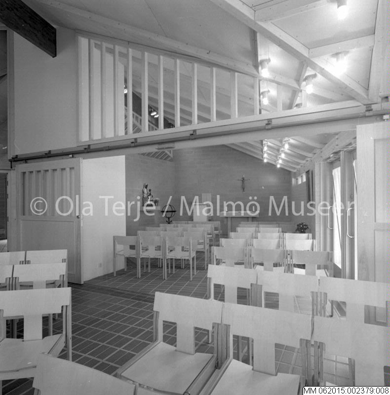 Interiör från Katolska kyrkan i Lund, 871027. Altare, predikstol, ljusstake, krucifix, helgonbild.