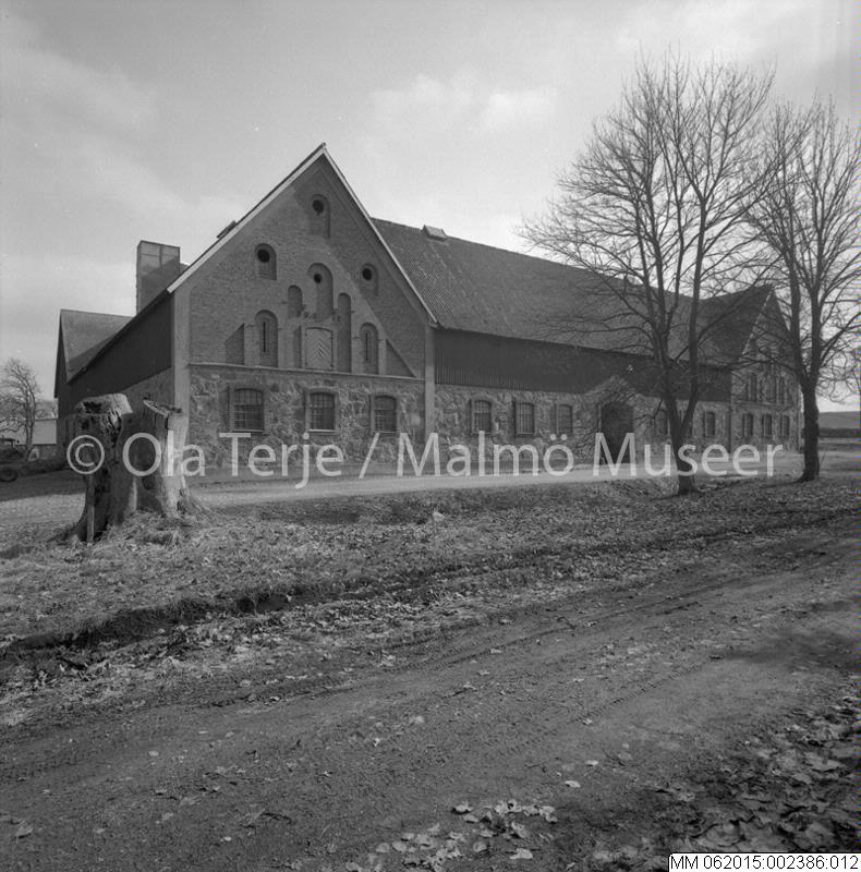 - Exteriör av ekonomibyggnad tillhörande Hyby slott. Bilderna beställda av professor Sten-Åke "Stånke" Nilsson, konstvetenskapliga institutionen i Lund, för ett bokprojekt om 1800-talets ombyggnader och renoveringar. Hyby, 860403.