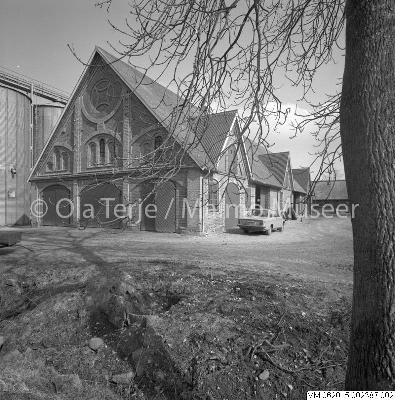 - Exteriör av ekonomibyggnader och silos tillhörande Hyby slott. Bilderna beställda av professor Sten-Åke "Stånke" Nilsson, konstvetenskapliga institutionen i Lund, för ett bokprojekt om 1800-talets ombyggnader och renoveringar. Hyby, 860403.