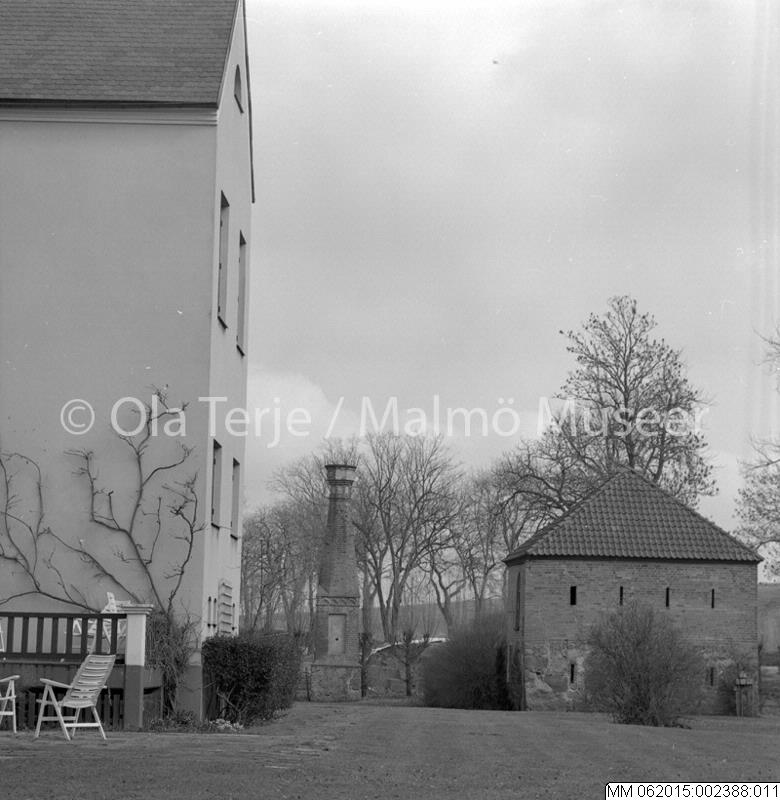 - Exteriör av bostadshus och ekonomibyggnad tillhörande Hyby slott. Bilderna beställda av professor Sten-Åke "Stånke" Nilsson, konstvetenskapliga institutionen i Lund, för ett bokprojekt om 1800-talets ombyggnader och renoveringar. Hyby, 860403.