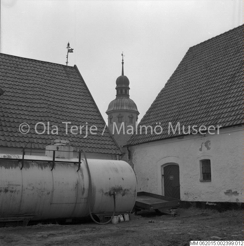 - Exteriör från Toppeladugårds slott, ekonomibyggnader och bränsletank. Bilderna beställda av professor Sten-Åke "Stånke" Nilsson, konstvetenskapliga institutionen i Lund, för ett bokprojekt om 1800-talets ombyggnader och renoveringar. 860414.