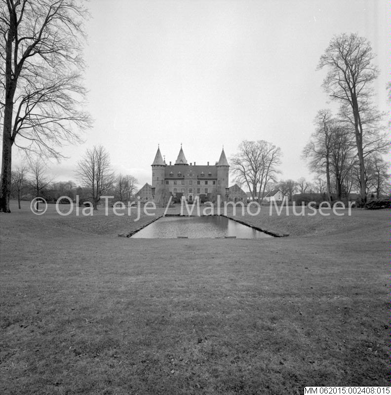 - Exteriör från Trolleholms slott, dammen. Bilderna beställda av professor Sten-Åke "Stånke" Nilsson, konstvetenskapliga institutionen i Lund, för ett bokprojekt om 1800-talets ombyggnader och renoveringar. 860423.