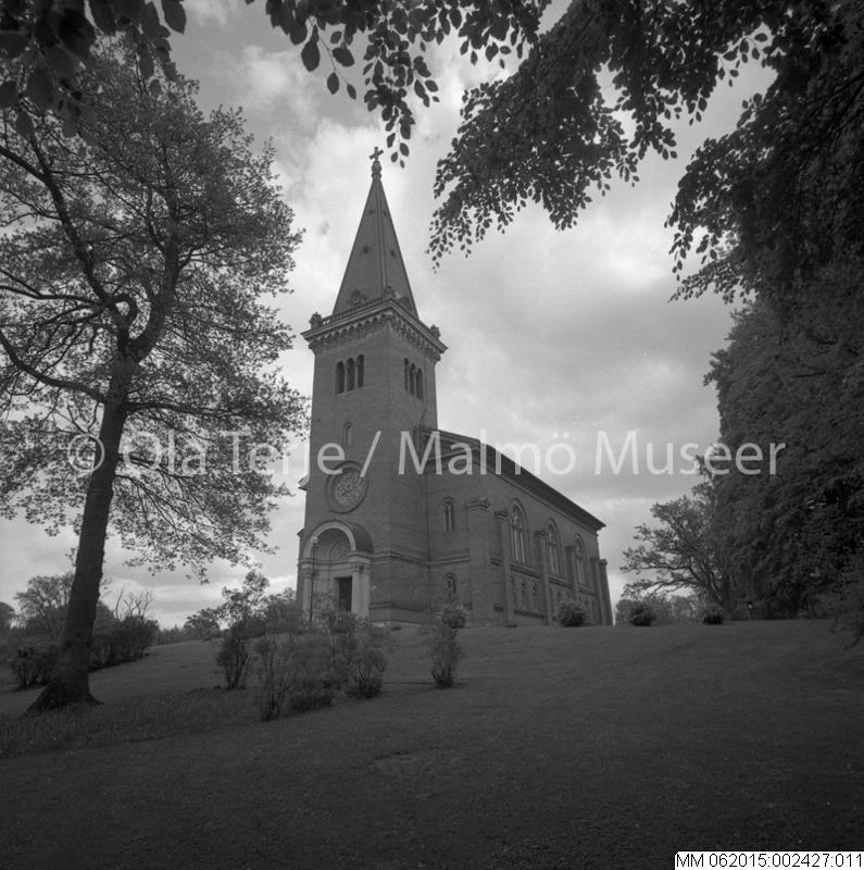 - Exteriör från Marsvinsholms kyrka. Bilderna beställda av professor Sten-Åke "Stånke" Nilsson, konstvetenskapliga institutionen i Lund, för ett bokprojekt om 1800-talets ombyggnader och renoveringar. 860530.