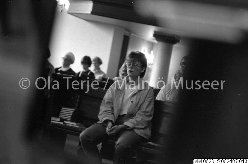 Mässa i Kirsebergs kyrka, mässdeltagare i kyrkbänken försjunken i bön. Malmö 840603.