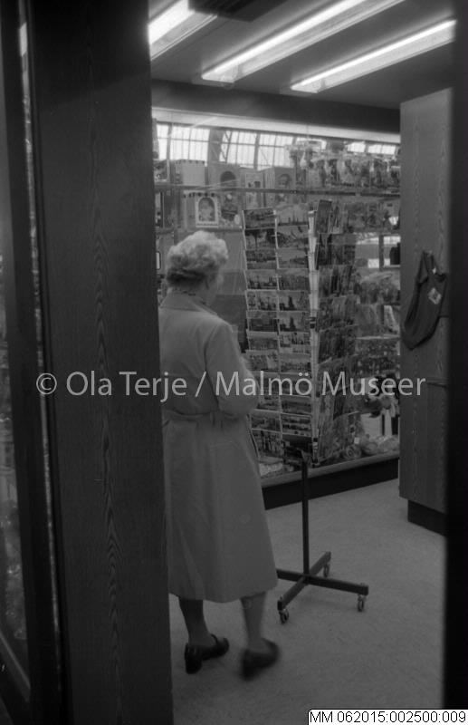 Kvinna väljer vykort i affär, Hamburg 790924. Uppdrag för bokförlaget Corona i Malmö, för en lärobok i tyska.