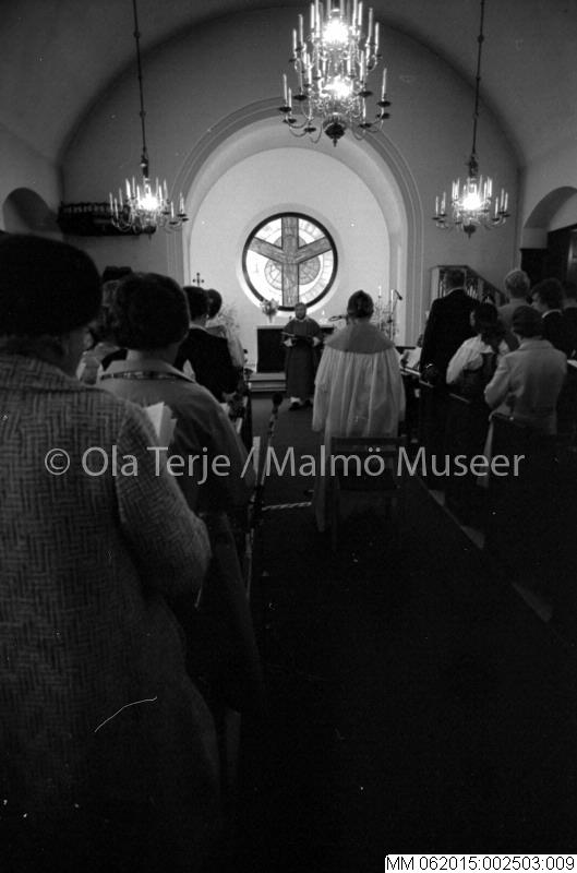 Pingstfirande i Kirsebergs kyrka, prästen Ingemar Thorin med flera. Malmö 800525.