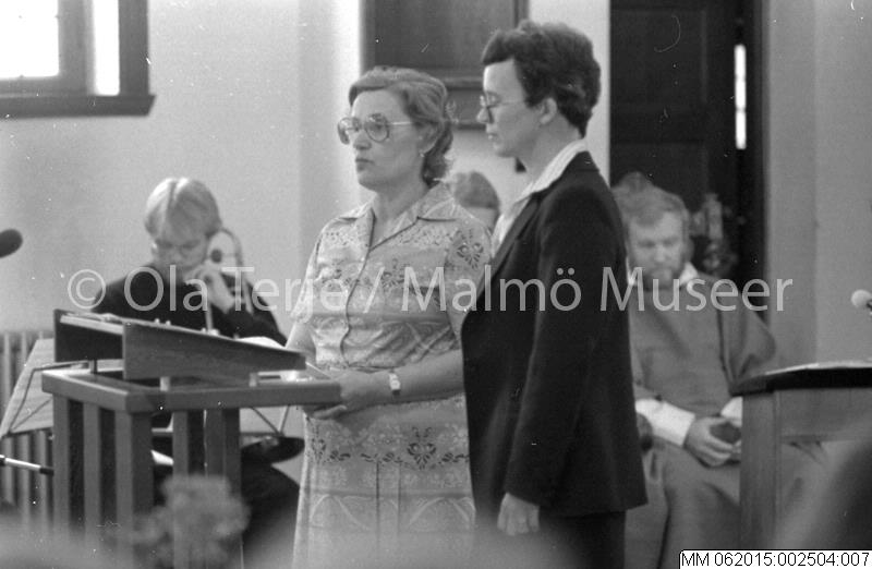 Pingstfirande i Kirsebergs kyrka, deltagare läser bibeltext, prästen Ingemar Thorin med flera. Malmö 800525.