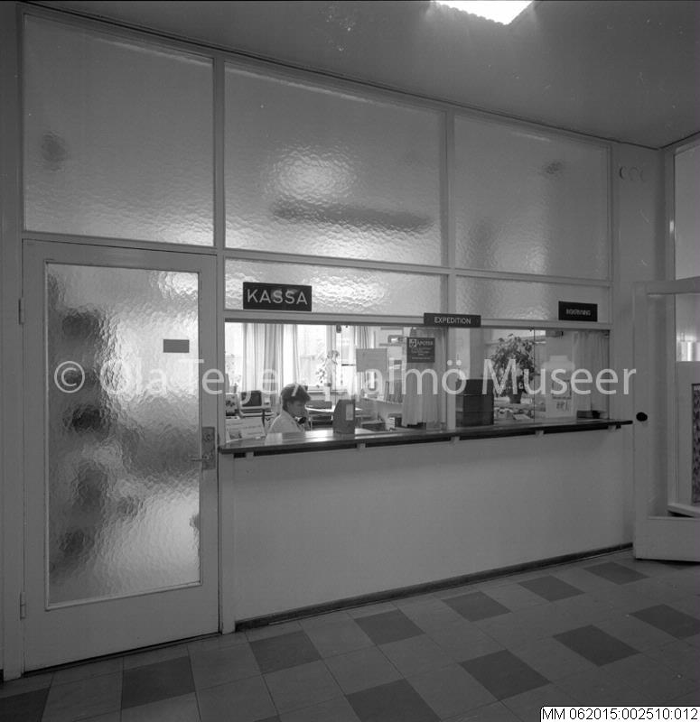 Onkologiska kliniken vid Lunds Lasarett, expedition med kassa och inskrivning. 880209.